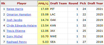 All RBs Drafted between picks 20 and 32 from 2016 to 2025